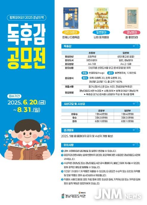 제이앤엠뉴스 | 경남대표도서관은 오는 8월 31일까지 '함께 읽어요!! 2025 경남의 책' 전국 독후감 공모전을 개최한다고 밝혔다.