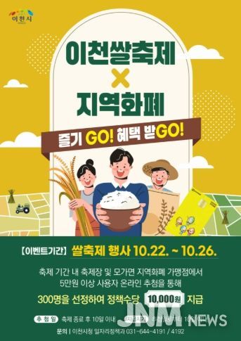 제이앤엠뉴스 | 이천시는 2025 이천쌀문화축제 기간에 지역화폐 이용을 촉진하고 지역경제를 활성화하기 위해 코나아이(주)의 경기지역화폐 사회공헌 재원을 활용하여 ‘이천쌀축제, 지역화폐로 즐기고(GO), 혜택받고(GO)’ 이벤트를 추진한다고 밝혔다.