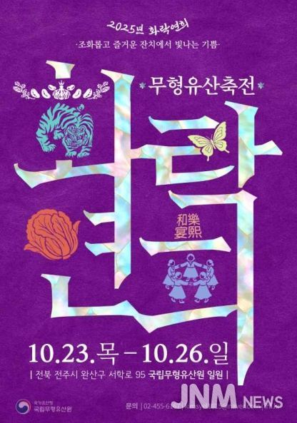 제이앤엠뉴스 | 국가유산청 국립무형유산원(원장 박판용)은 10월 23일 오후 5시 개막식을 시작으로 26일까지 국립무형유산원(전북 전주시)에서 다양한 무형유산을 한 자리에서 경험할 수 있는 무형유산 종합축제 「2025년 무형유산축전, ‘화락연희’」를 개최한다.