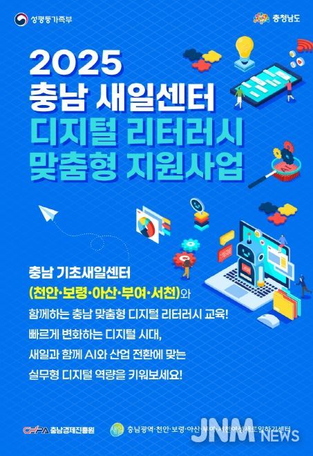 제이앤엠뉴스 | 충남경제진흥원 내 충남광역여성새로일하기센터는 천안·보령·아산·부여·서천 등 도내 5개 기초새일센터와 함께 '2025 새일센터 디지털 리터러시 맞춤형 지원사업'을 본격적으로 추진한다고 밝혔다.