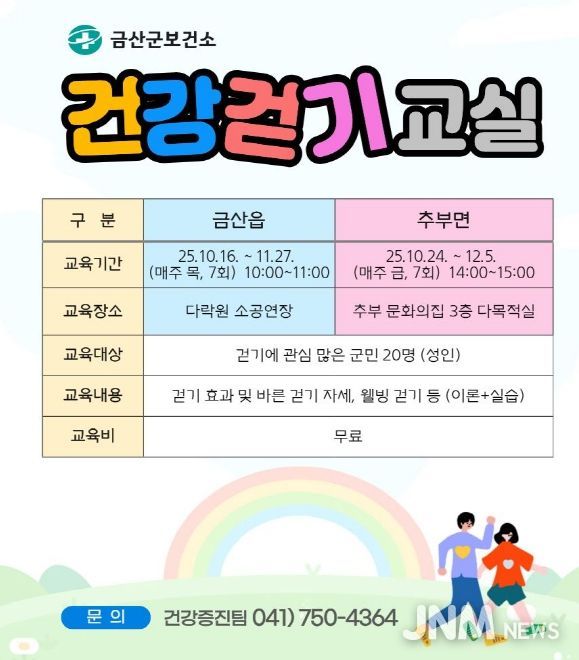 제이앤엠뉴스 | 금산군보건소는 군민의 건강증진과 생활 속 신체활동 실천을 위해 오는 12월까지 금산읍·추부면에서 건강 걷기 교실을 운영한다.
