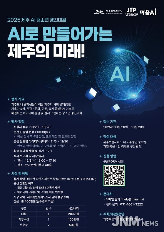 제주특별자치도와 제주테크노파크(원장 지영흔, 제주TP)는 도내 청소년의 AI 이해도 향상과 창의적 문제 해결 역량 강화를 위해 ‘2025 제주 AI 청소년 경진대회’ 참가자를 오는 28일까지 모집한다고 20일 밝혔다.