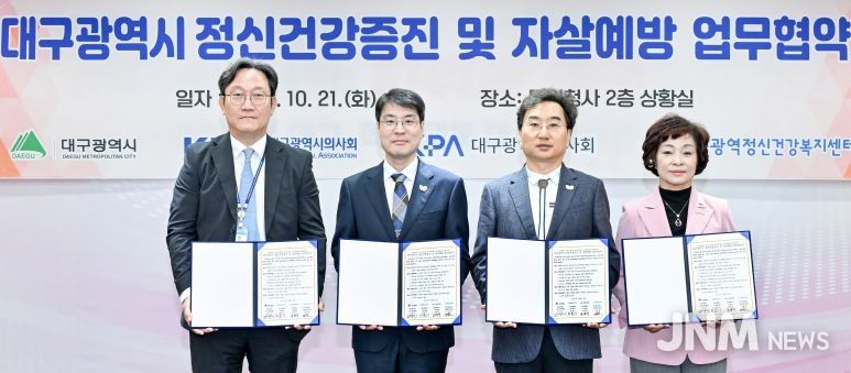 제이앤엠뉴스 | 대구광역시는 10월 21일 오전 11시 동인청사 2층 상황실에서 ‘대구광역시 정신건강 증진 및 자살예방 업무협약’을 체결했다. 이번 협약은 대구 시민의 정신건강 증진과 자살 예방을 위한 지역사회 거버넌스 구축을 목표로 한다.