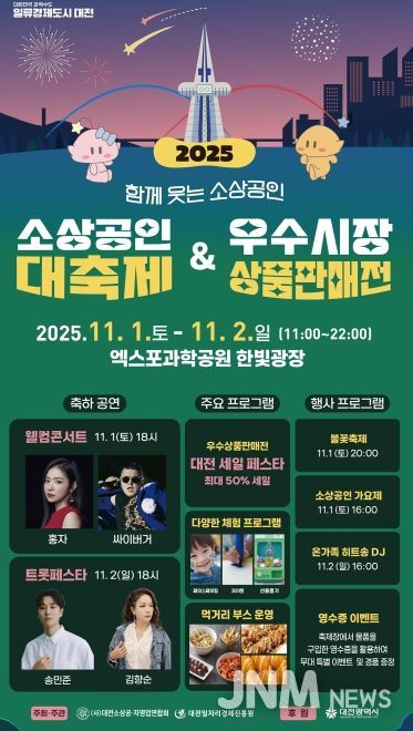 제이앤엠뉴스 | 대전시는 11월 1일부터 2일까지 이틀간 엑스포과학공원 한빛광장 일원에서 ‘2025년 소상공인 대축제 · 우수시장 상품판매전’을 개최한다.