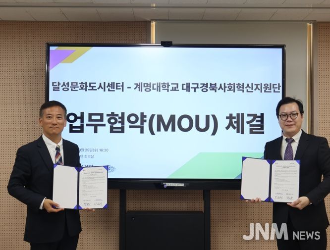 제이앤엠뉴스 | (재)달성문화재단(이사장 최재훈) 달성문화도시센터는 지난 29일 계명대학교 대구경북사회혁신지원단(단장 신진교)과 업무협약을 체결했다고 밝혔다.