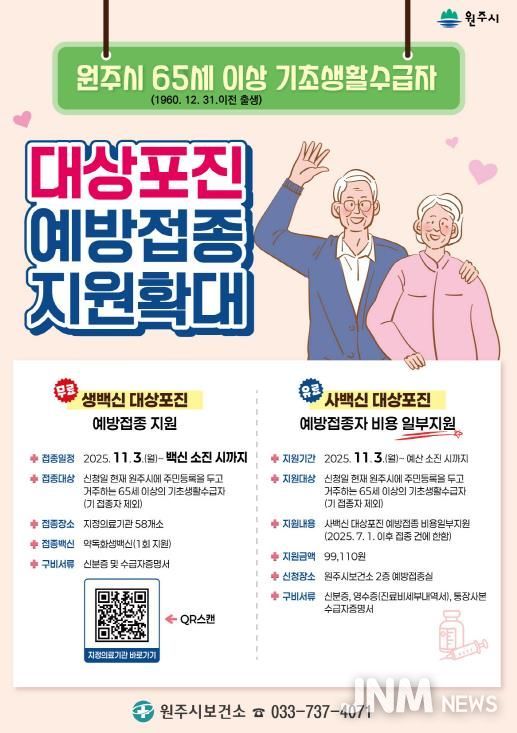 제이앤엠뉴스 | 원주시는 11월 3일부터 대상포진 무료 예방접종 대상을 기존 70세 이상 기초생활수급자에서 65세 이상 기초생활수급자로 확대한다.