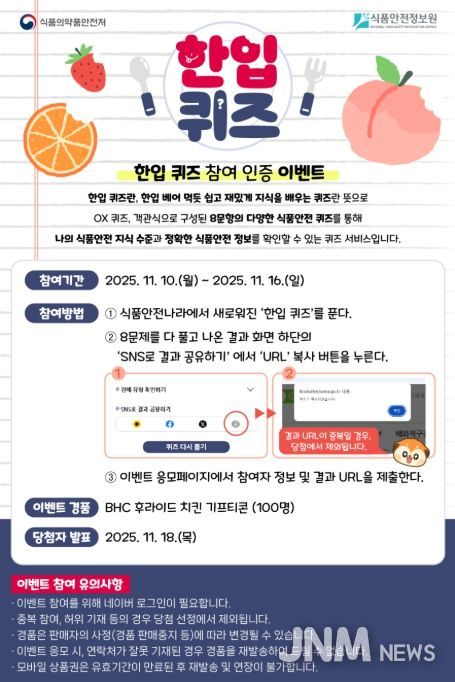 제이앤엠뉴스 | 식품의약품안전처와 식품안전정보원은 국민이 식품 안전 정보를 쉽고 재밌게 알 수 있도록 식품안전나라의 퀴즈 서비스인 ‘한입 퀴즈’를 11월 10일부터 제공한다고 밝혔다.