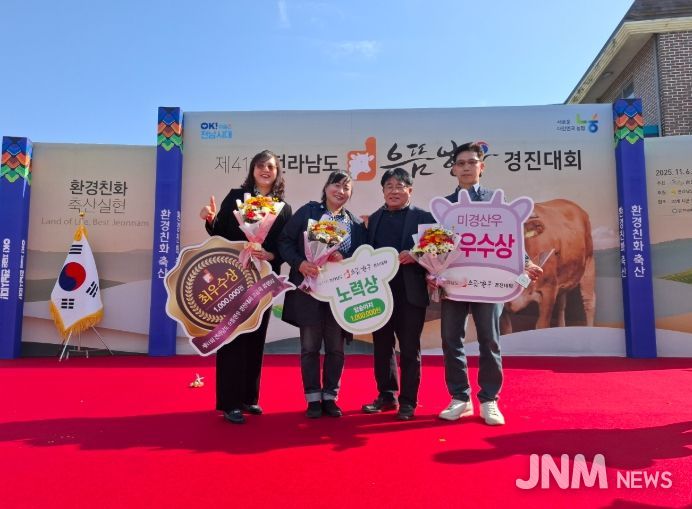 제이앤엠뉴스 | 곡성군은 지난 6일 순천광양축협에서 열린‘2025년 제41회 전라남도 으뜸한우 경진대회’에서 고급육 부문 옥과면 최하나 농가가“최우수상”, 우량한우(미경산우) 부문 목사동면 조신익 농가가 “최우수상”, 우량한우(암송아지) 부문 겸면 이금숙 농가가 “노력상”을 받는 쾌거를 이뤘다고 10일 밝혔다.
