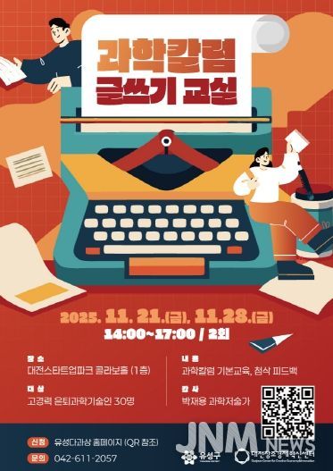 제이앤엠뉴스 | 대전 유성구는 오는 21일과 28일 대전스타트업파크센터에서 고경력 은퇴 과학기술인 대상 ‘과학 칼럼 글쓰기 교실’을 운영한다.