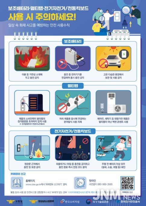 소방청은 한국소비자원, 국가기술표준원, 한국전기안전공사, 경남소방본부 등 관계기관과 협력하여 다음과 같은 전기제품 안전사용 수칙을 국민에게 당부했다. 보조배터리는 고온·다습한 환경에서 사용하거나 보관하지 않도록 하고, 멀티탭은 여러 전기제품을 동시에 연결하지 않으며, 과부하 사용을 자제해야 한다. 전기자전거와 전동킥보드는 화재 시 원활한 대피를 위해 현관문 근처나 실내에서 충전·보관하지 말고, 충전 중 외출은 금지하며, 충전 후에는 반드시 전원 차단을 해야 한다.