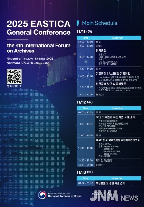 제이앤엠뉴스 | 행정안전부 국가기록원은 11월 10일부터 13일까지 부산 누리마루 APEC 하우스에서 '2025년 동아시아기록관리협의회(EASTICA) 정기총회 및 제4회 한국 국가기록원 국제기록관리포럼'을 개최한다고 밝혔다.
