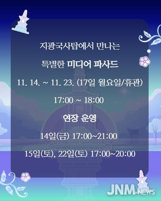 미디어파사드 전시는 11월 14일부터 23일까지 운영되며, 관람 시간은 오후 5시부터 6시까지다. 단, 17일은 휴관하며, 14일은 오후 9시까지, 15일과 22일은 오후 8시까지 연장 운영한다.