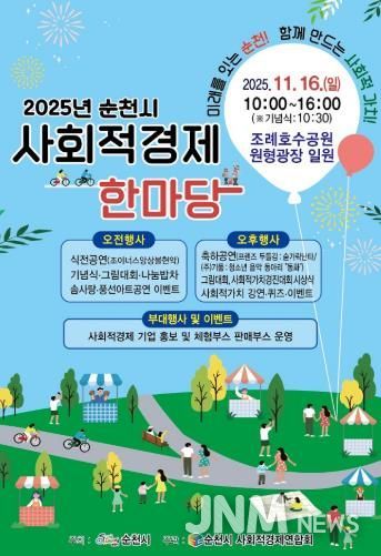 제이앤엠뉴스 | 순천시는 오는 16일 조례호수공원 원형광장 일원에서 ‘미래를 잇는 순천! 함께 나누는 사회적 가치’를 주제로 “2025년 순천시 사회적경제 한마당”을 개최한다고 밝혔다.