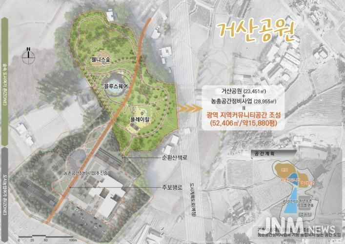 특히 이번 사업은 ‘농촌공간 정비사업’과 연계해 시너지를 극대화한 것이 특징이다. 거산공원 부지 23,451㎡에 농촌공간 정비사업 28,955㎡를 더해, 총 52,406㎡(약 1만 6천 평) 규모의‘광역지역커뮤니티공간’으로 조성한다.