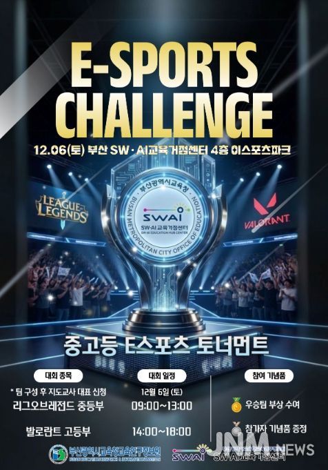 제이앤엠뉴스 | 부산광역시교육청 교육연구정보원은 6일 북구 덕천동 SW·AI교육거점센터 e스포츠파크에서 관내 중·고등학교 e스포츠 8팀이 참가하는 ‘2025년 하반기 e스포츠 챌린지’를 개최한다.