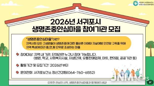 제이앤엠뉴스 | 서귀포보건소는 2026년 생명존중안심마을에 새롭게 함께할 참여기관을 모집한다고 밝혔다. 생명존중안심마을은 마을별 생명존중 네트워크를 형성하는 핵심 사업으로, 보건의료․교육․사회복지․지역사회․공공기관의 5가지 영역별 참여기관이 함께하며 마을 내 생명존중 문화 조성을 위해 협력하는 사업이다.