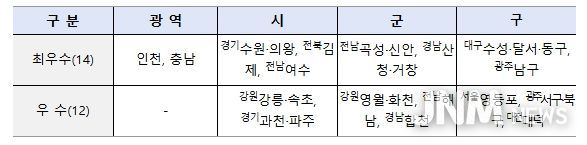 종합점수 산정결과, 인천, 충남 등 광역 지자체 2곳, 경기 수원, 전남 곡성, 대구 수성 등 기초 지자체 24곳 등 총 26곳이 우수 지방정부로 선정됐다.