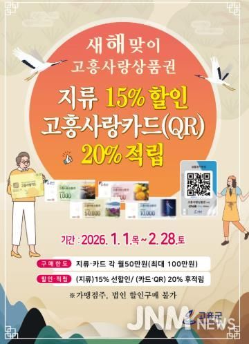 제이앤엠뉴스 | 고흥군은 새해를 맞아 군민의 장보기 부담을 대폭 낮추고 지역경제에 즉각적인 활력을 불어넣기 위해, 내년 1월부터 2월까지 두 달간 ‘새해맞이 고흥사랑상품권 특별할인 행사’를 추진한다고 밝혔다.