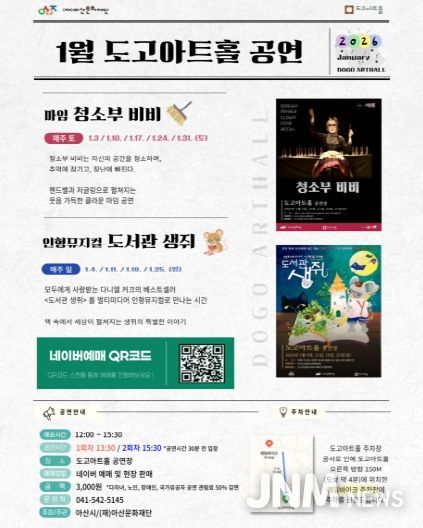 제이앤엠뉴스 | 아산문화재단(대표이사 유성녀)이 운영하는 도고아트홀이 2026년 1월, 주말 상시 공연과 전시를 통해 새해 시민들의 문화 일상화를 이어간다. 이번 프로그램은 가족 단위 관람객과 어린이를 중심으로 공연과 전시를 함께 즐길 수 있도록 구성돼 있어, 새해 첫 달부터 풍성한 문화 향유 기회를 제공한다.