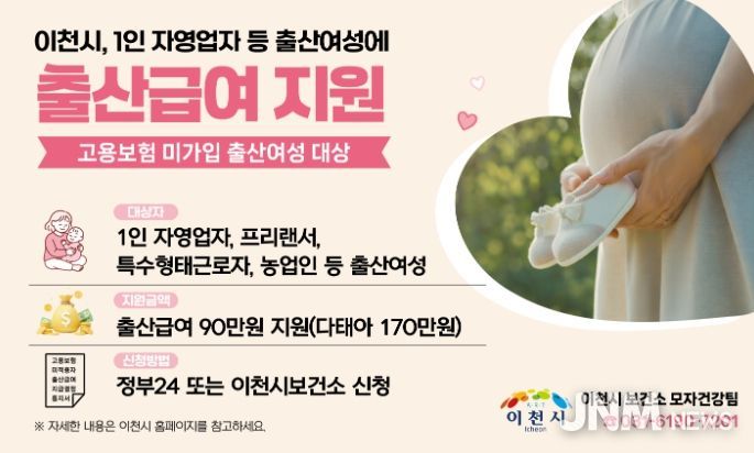 제이앤엠뉴스 | 이천시가 2026년부터 경기도 최초로, 고용보험 가입 대상이 되지 않아 출산휴가급여를 받지 못하는 1인 자영업자, 프리랜서, 특수형태근로자, 농업인 등 출산여성을 대상으로 출산급여를 지원하는‘1인 자영업자 등 출산급여 지원사업’을 새롭게 시행한다.