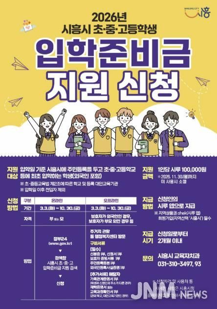 제이앤엠뉴스 | 시흥시는 올해부터 관내 초중고 입학 자녀 가정에 입학준비금을 10만 원씩 지원한다. 이번 지원은 도서나 문구류 등을 새로 마련해야 하는 신입생 가정의 경제적 부담을 줄여주고, 교육 기본권을 강화하고자 추진됐다.
