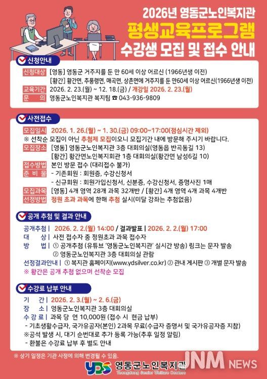 영동은 신청 인원이 모집 정원을 초과할 경우 추첨제로 수강생을 선발하며, 공개 추첨은 2월 2일 오후 2시, 유튜브 ‘영동군노인복지관’ 채널을 통해 실시간으로 중계될 예정이다.