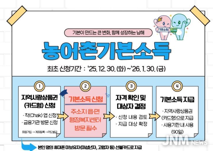 제이앤엠뉴스 | 남해군은 농어촌 기본소득 신청과 관련해 지역사랑상품권 ‘착(chak)카드’를 발급했더라도 기본소득 신청은 반드시 주소지 관할 읍·면 행정복지센터를 직접 방문해 접수해야 한다고 밝혔다.