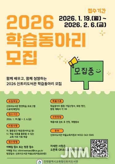 제이앤엠뉴스 | 인천광역시교육청신트리도서관은 지역주민의 자발적인 학습 문화 조성과 지속 가능한 마을 학습공동체 형성을 위해 2026년 학습동아리를 모집한다.