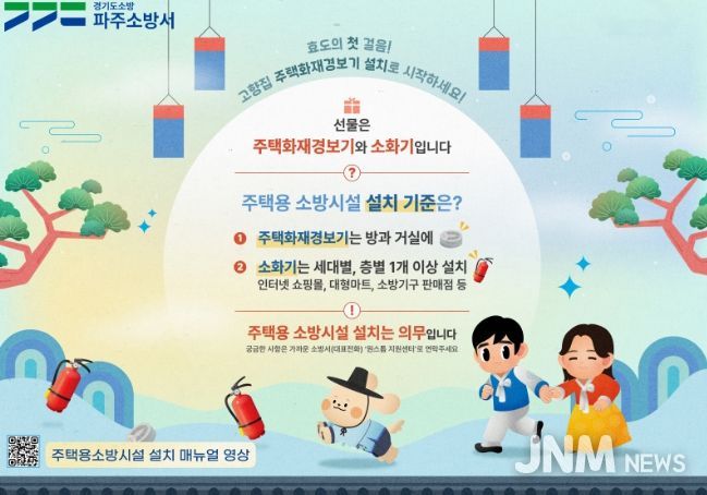 제이앤엠뉴스 | 파주소방서는 설 명절을 맞아 ‘주택용 소방시설 설치하기’ 홍보를 집중 추진하고 있으며, 최근 파주시에서 시민이 소화기를 활용하여 화재를 자체 진화한 사례가 발생해 주택용 소방시설의 중요성이 다시금 주목받고 있다.