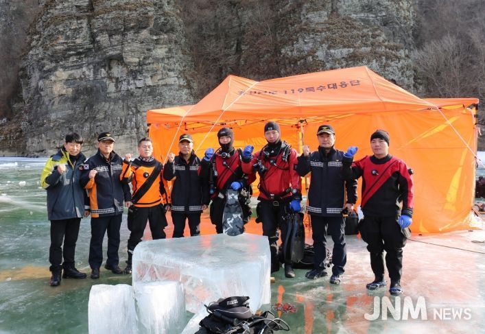훈련에서는 ▴빙판을 깨고 입수하는 구조와 인양 절차 ▴수중 수색과 수중 통신 실습 ▴구조대원 위기 상황 발생 시 안전 확보 절차 등을 중점적으로 점검하며 실전 대응 능력 강화에 중점을 뒀다.