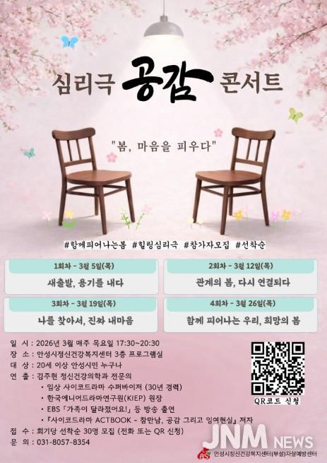 제이앤엠뉴스 | 안성시보건소 안성시정신건강복지센터(부설 자살예방센터)는 시민의 정신건강 증진과 생명존중 문화 조성을 위해 심리극(사이코드라마) 기법을 활용한 체험형 집단 프로그램 '공감' 콘서트를 오는 3월 운영한다고 밝혔다.