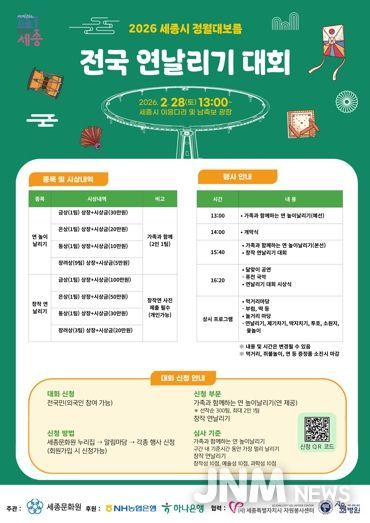 세종특별자치시는 세종문화원 주관으로 ‘2026년 세종시 정월대보름 전국 연날리기 대회’ 참여자를 모집한다고 밝혔다.