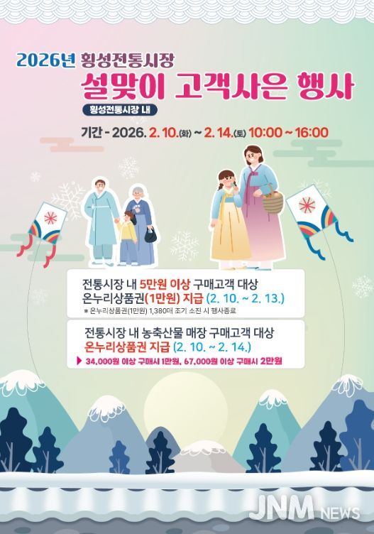 군은 2월 10일부터 14일까지 5일간 횡성 전통시장 일원에서 ‘2026년 설맞이 고객 사은 행사’를 개최한다고 밝혔다.