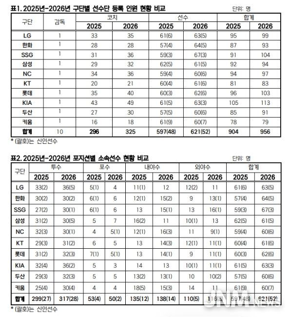 제이앤엠뉴스 | KBO는 2월 10일(화) 2026년 KBO 리그 소속 선수 명단을 공시했다. 10개 구단은 총 621명의 선수를 등록해, 597명이 등록했던 2025년보다 24명이 늘어났다.