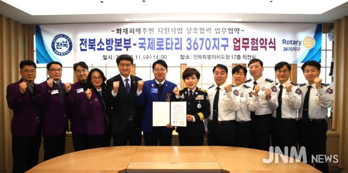 제이앤엠뉴스 | 전북특별자치도소방본부는 11일 국제로타리 3670지구(총재 김성희)와 화재피해주민 지원사업의 원활한 추진을 위한 상호협력 업무협약을 체결했다고 밝혔다.