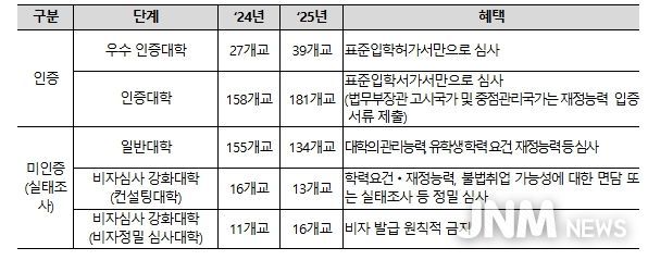 한편, 인증대학 외에 외국인 유학생이 1명 이상 재적 중인 대학에 대해서는 ‘유학생 유치‧관리 실태조사’를 실시하고, 일정 기준을 충족하지 못할 시 비자심사 강화대학(컨설팅대학, 비자정밀 심사대학)으로 지정했다. 이를 통해 대학이 외국인 유학생의 유치 단계에서 어학 능력과 재정 능력 등을 엄격히 심사하도록 하고, 유학생 관리 전반에 대한 대학의 책임을 강화할 예정이다.