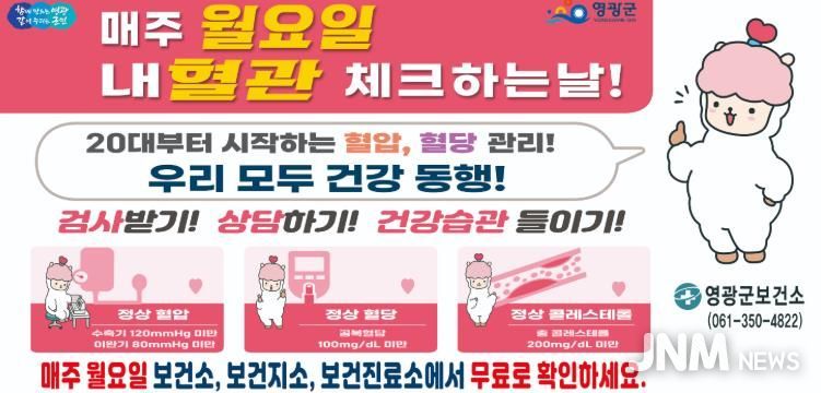 제이앤엠뉴스 | 영광군은 심뇌혈관질환 예방을 위해 매주 월요일을‘혈관 건강 체크하는 날’로 지정해 오는 2월 23일부터 본격 추진한다고 밝혔다.