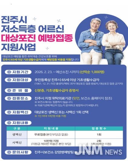 제이앤엠뉴스 | 진주시는 2월 23일부터 65세 이상 취약계층(기초생활수급자) 1,000명을 대상으로 ‘대상포진 예방접종 지원사업’을 실시 한다고 밝혔다.