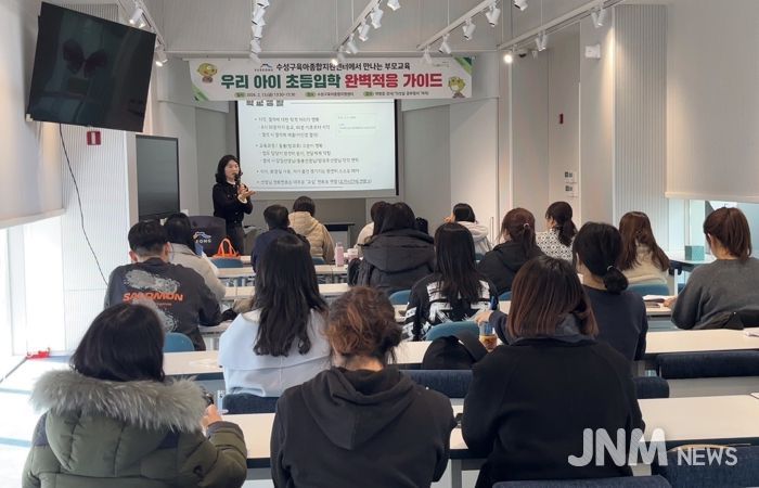 제이앤엠뉴스 | 대구 수성구 육아종합지원센터는 지난 13일 관내 초등학교 입학을 앞둔 자녀를 양육하는 부모 30여 명을 대상으로 ‘예비초등 부모교육(우리 아이 초등입학 완벽 적응 가이드)’을 진행했다.
