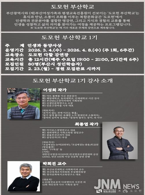 제이앤엠뉴스 | 부산시는 과거 시장 관사에서 시민을 위한 복합문화공간으로 재탄생한 '도모헌'에서 시민들의 삶에 깊이를 더하고 인생 2막의 이정표를 제시하는 '2026년 도모헌 부산학교 프로그램'을 본격 운영한다고 밝혔다.