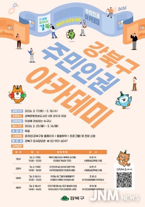 제이앤엠뉴스 | 서울 강북구는 생활 속 인권 존중 문화를 확산하고 인권 친화적 지역사회를 조성하기 위해 ‘2026년 제11기 강북구 주민 인권아카데미’를 운영한다고 밝혔다.