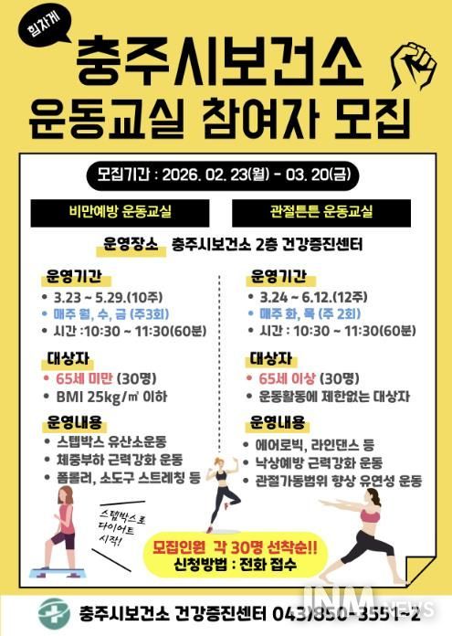제이앤엠뉴스 | 충주시 보건소는 시민들의 건강한 생활 습관 형성과 활기찬 일상 회복을 위해 ‘2026년 상반기 운동교실’ 참여자를 오는 3월 20일까지 모집한다고 23일 밝혔다.