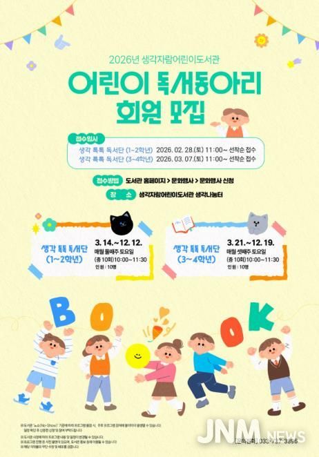 제이앤엠뉴스 | 원주시 생각자람어린이도서관은 초등학생들의 원활한 독서 활동을 돕기 위해 2026년 어린이 독서동아리 ‘생각 톡톡 독서단’ 회원을 모집한다.
