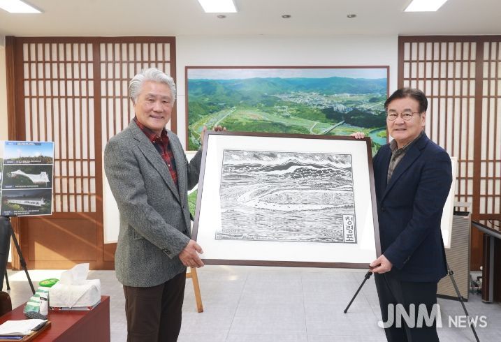 제이앤엠뉴스 | 목판화가로 활동하고 있는 양태수 작가가 영월의 아름다운 자연과 마을 풍경을 담은 목판화 작품 30점을 영월군에 기증했다.