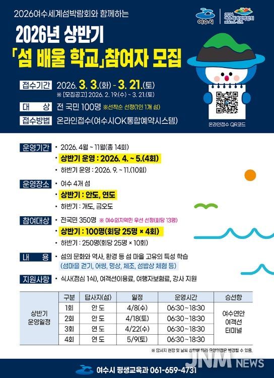 제이앤엠뉴스 | 여수시는 2026여수세계섬박람회의 성공적인 개최를 위한 국민적 관심을 높이고 지역특화형 섬 답사 프로그램을 통해 유익한 학습경험을 제공하고자 '2026년 상반기 섬배울학교' 참여자를 모집한다.