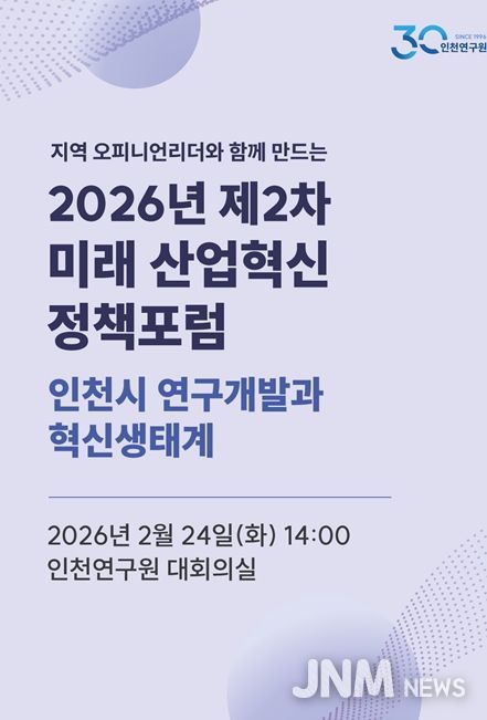 제이앤엠뉴스 | 인천연구원은 2026년 2월 24일 오후 2시, 인천연구원 대회의실에서 '제2차 인천 미래 산업혁신 정책포럼'을 개최한다.