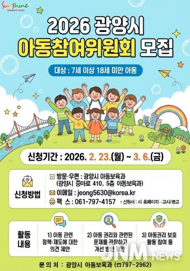 제이앤엠뉴스 | 광양시는 아동의 권리 증진과 정책 참여 기회 확대를 위해 오는 2월 23일부터 3월 6일까지 '2026년 광양시 아동참여위원회' 위원을 공개 모집한다고 밝혔다.