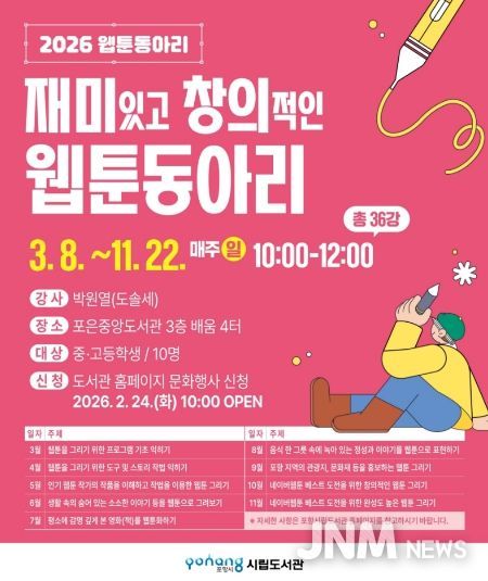 제이앤엠뉴스 | 포항시립포은중앙도서관은 오는 24일 오전 10시부터 2026년 웹툰 동아리 수강생을 선착순 모집한다. 웹툰 동아리는 지역 중·고등학생을 대상으로 3월부터 본격 운영될 예정이다.