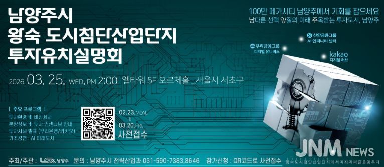 제이앤엠뉴스 | 남양주시는 오는 3월 25일 서울 서초구 엘타워 오르체홀에서 ‘남양주시 왕숙 도시첨단산업단지 투자유치설명회’를 개최하며, 이에 앞서 3월 20일까지 참여 희망 기업을 대상으로 사전접수를 진행한다고 밝혔다.