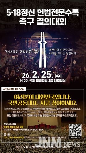제이앤엠뉴스 | 광주광역시와 전국 시민사회단체, 5·18단체 등은 오는 25일 오후 2시 국회의원회관 대회의실에서 ‘5·18정신의 헌법전문 수록을 촉구하는 국민결의대회’를 개최한다.